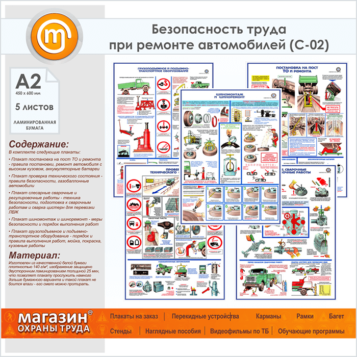 Плакат «Техника безопасности при ремонте автомобилей» (С-02, ламинированная бумага, А2, 5 листов) в Иркутске купить