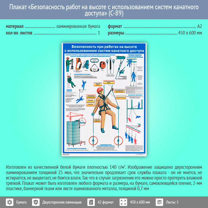 Плакат «Безопасность работ на высоте с использованием систем канатного доступа» (С-89, ламинированная бумага, А2, 1 лист) в Иркутске купить