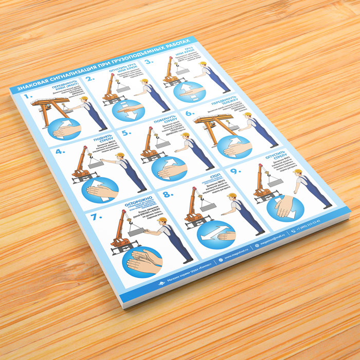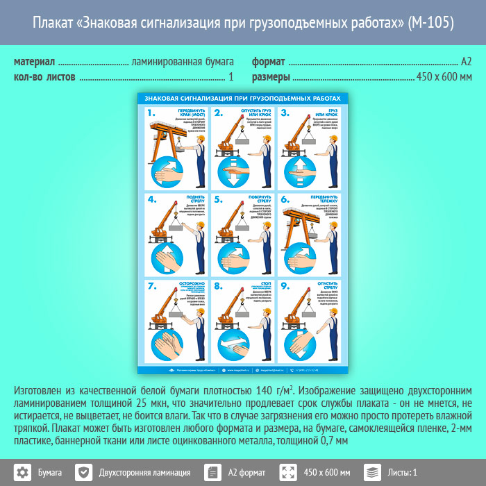 Плакат «Знаковая сигнализация при грузоподъемных работах» (М-105, ламинированная бумага, А2, 1 лист) в Иркутске купить