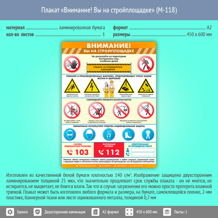 Плакат «Внимание! Вы на стройплощадке» (М-118, ламинированная бумага, А2, 1 лист) в Иркутске купить