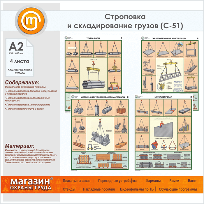 Плакаты «Строповка и складирование грузов» (С-51, ламинированная бумага, А2, 4 листа) в Иркутске купить