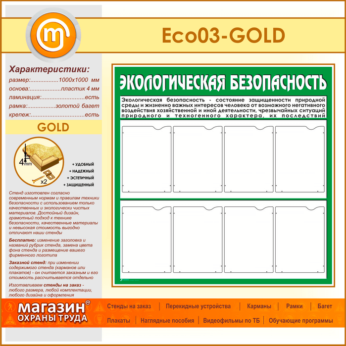 Стенд «Экологическая безопасность» с 8 карманами (ECO-03-GOLD) в Иркутске купить