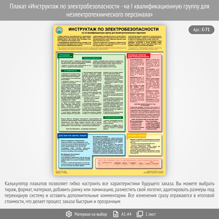 Плакат «Инструктаж по электробезопасности - на I квалификационную группу для неэлектротехнического персонала» (С-71, 1 лист) в Иркутске купить