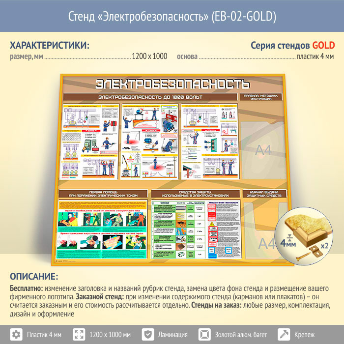 Стенд «Электробезопасность до 1000 вольт» с плоским и объемным карманами (EB-02-GOLD) в Иркутске купить