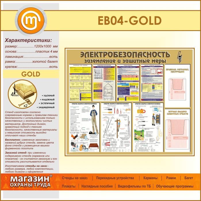 Стенд «Электробезопасность. Заземление и защитные меры» с 2 объемными карманами (EB-04-GOLD) в Иркутске купить