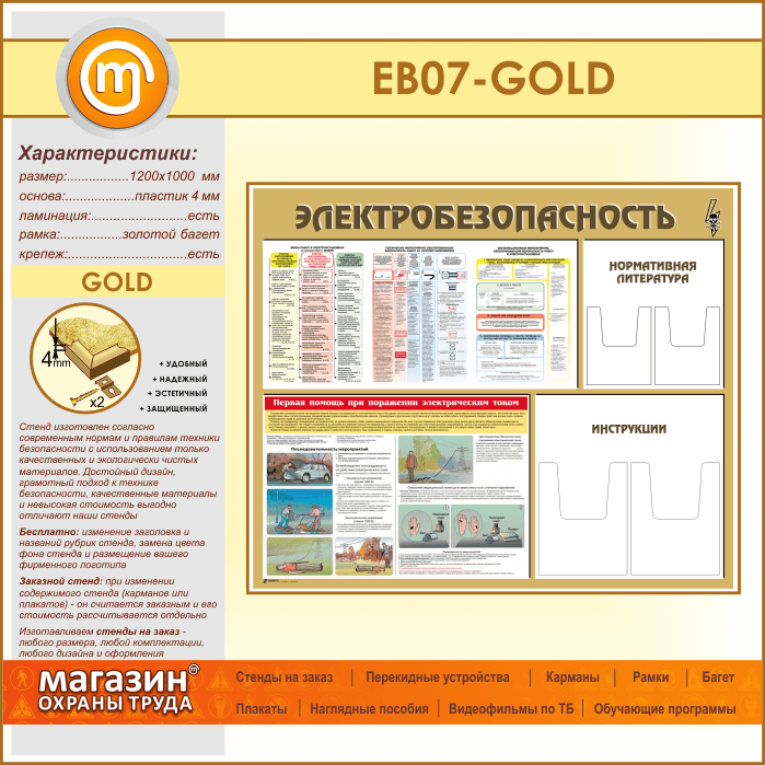 Стенд «Электробезопасность» с 4 объемными карманами (EB-07-GOLD) в Иркутске купить