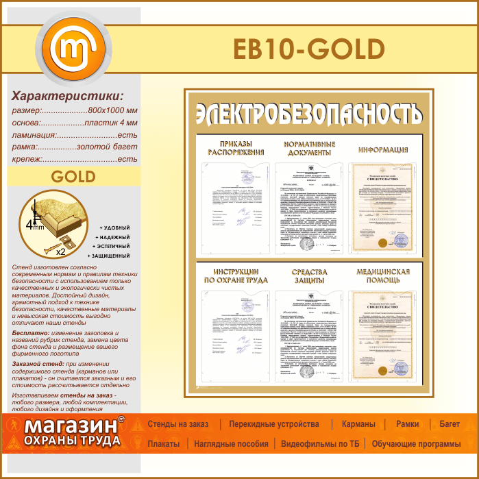 Стенд «Электробезопасность» с 6 карманами (EB-10-GOLD) в Иркутске купить