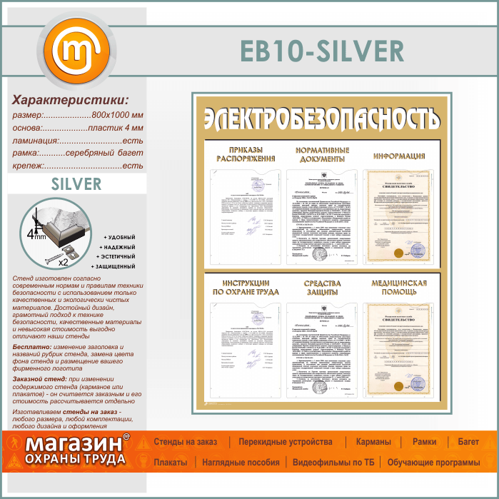 Стенд «Электробезопасность» с 6 карманами (EB-10-SILVER) в Иркутске купить