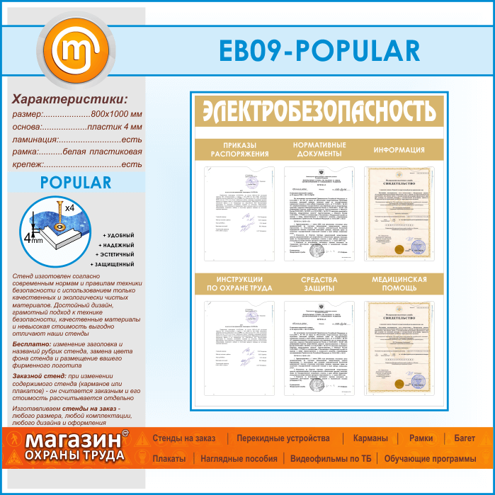 Стенд «Электробезопасность» с 6 карманами (EB-09-POPULAR) в Иркутске купить