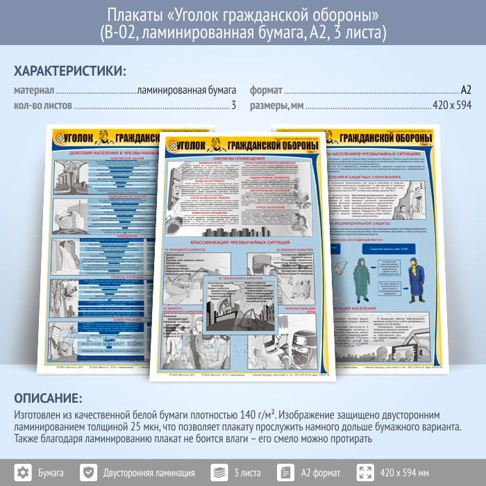 Плакаты «Уголок гражданской обороны» (В-02, ламинированная бумага, А2, 3 листа) в Иркутске купить