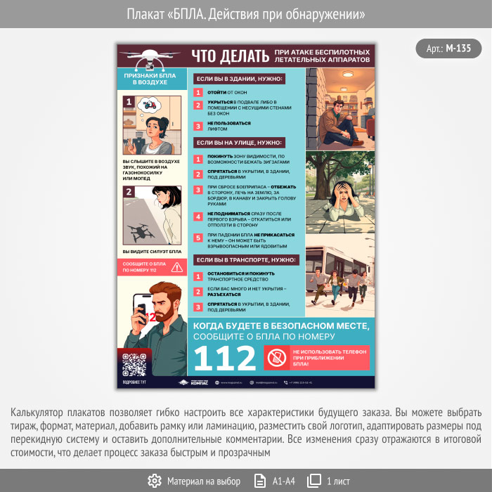 Плакат «БПЛА. Действия при обнаружении» с QR (М-135, 1 лист) в Иркутске купить
