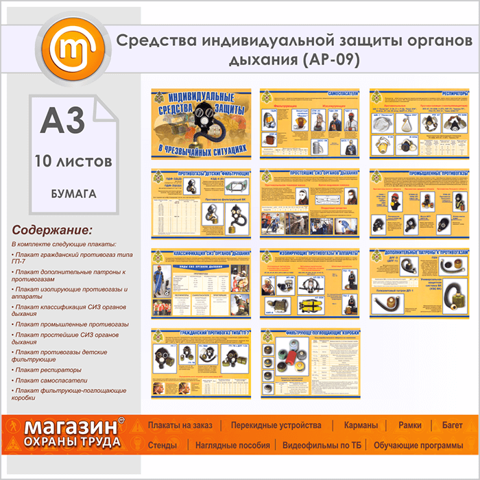 Плакаты «Средства индивидуальной защиты органов дыхания» (АР-09, бумага, А3, 10 листов) в Иркутске купить