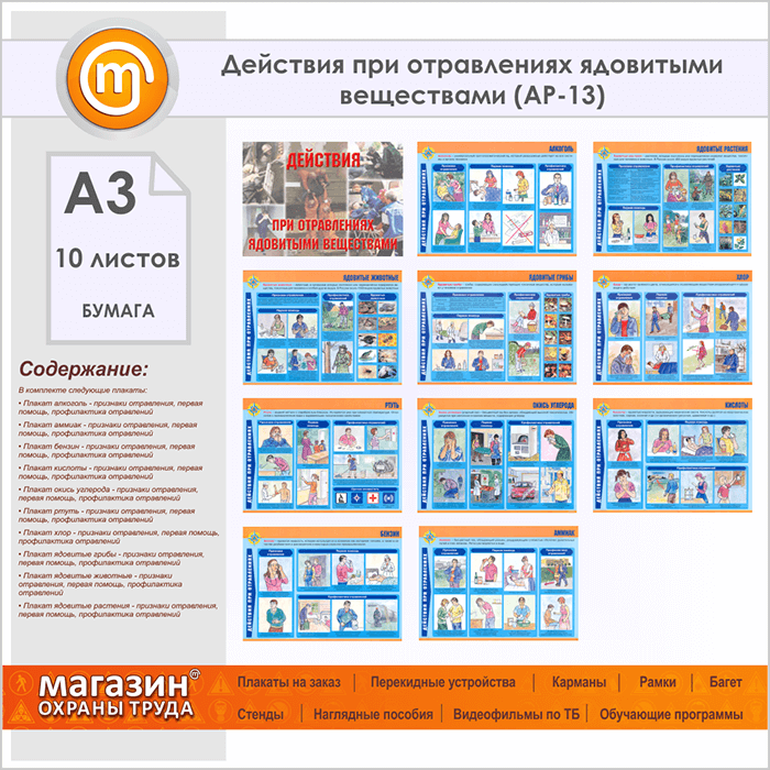 Плакаты «Действия при отравлениях ядовитыми веществами» (АР-13, бумага, А3, 10 листов) в Иркутске купить