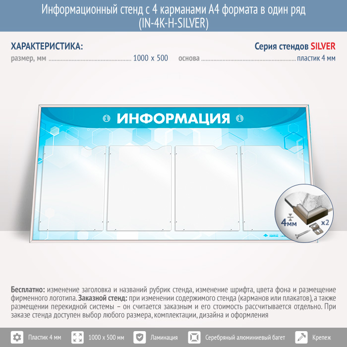 Информационный стенд с 4 карманами А4 формата в один ряд (IN-4K-H-SILVER) в Иркутске купить