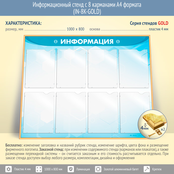 Информационный стенд с 8 карманами А4 формата (IN-8K-GOLD) в Иркутске купить
