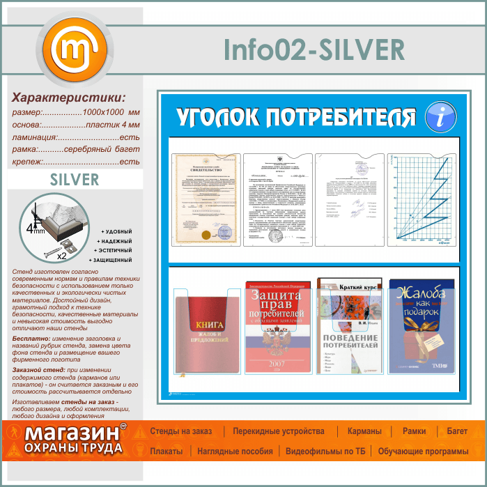 Стенд «Уголок потребителя» с 4 плоскими и 4 объемными карманами А4 формата (IN-02-SILVER) в Иркутске купить