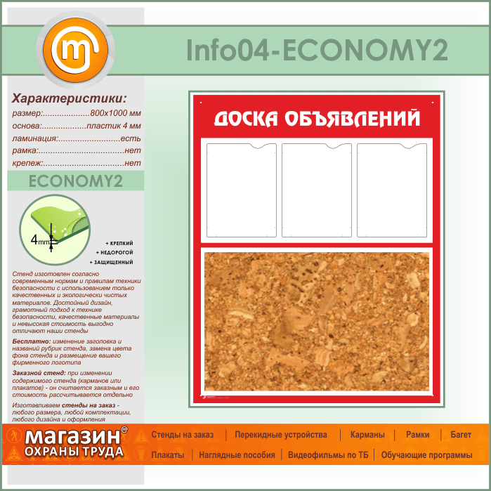 Стенд «Доска объявлений» с пробковым полотном и 3 карманами А4 формата (IN-04-ECONOMY2) в Иркутске купить