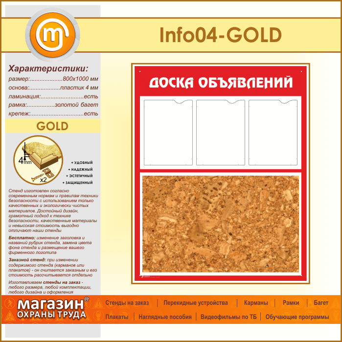 Стенд «Доска объявлений» с пробковым полотном и 3 карманами А4 формата (IN-04-GOLD) в Иркутске купить
