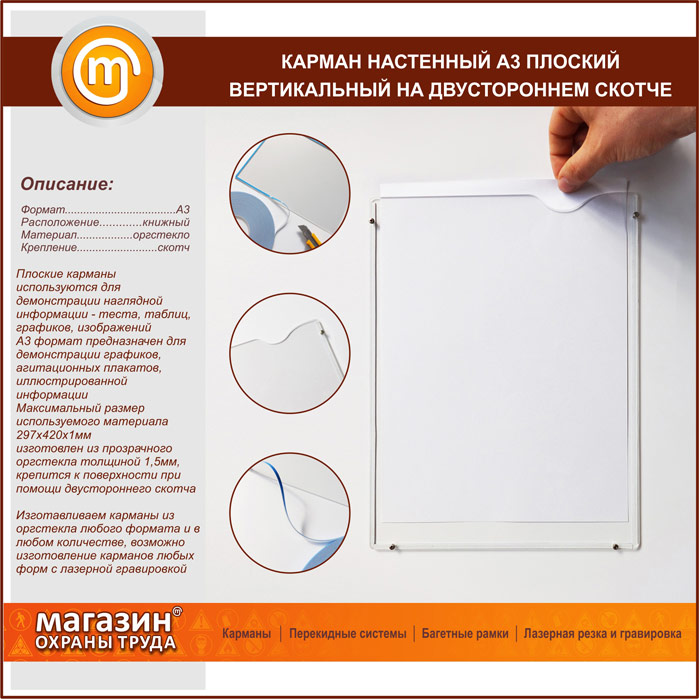 Карман настенный А3 плоский вертикальный на двустороннем скотче в Иркутске купить