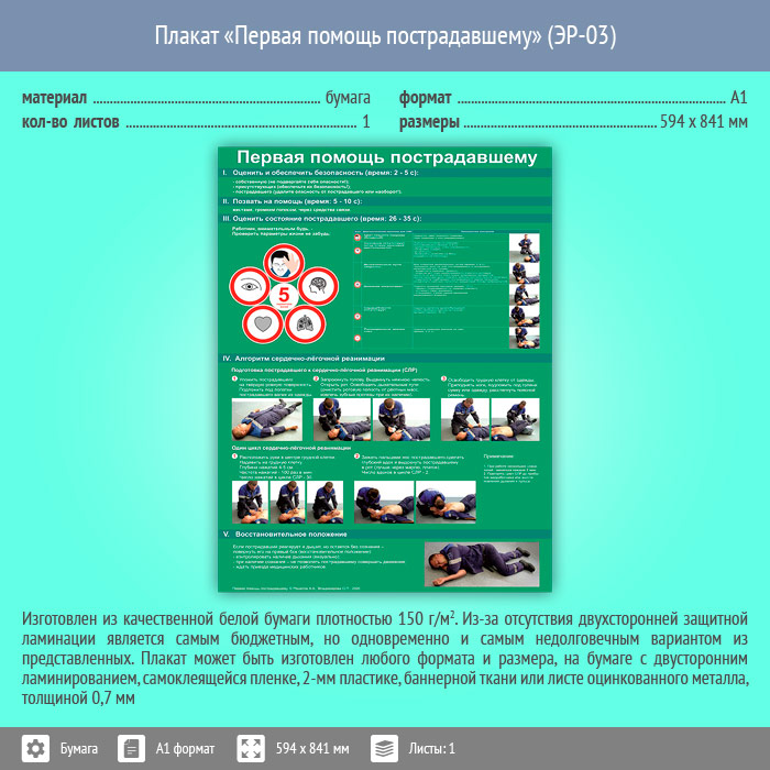 Плакат «Первая помощь пострадавшему» (ЭР-03, бумага, А1, 1 лист) в Иркутске купить