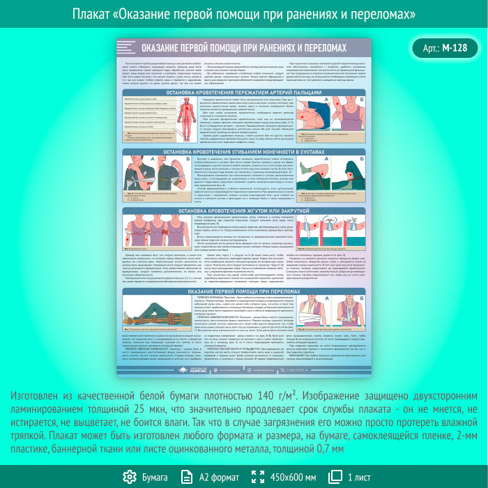 Плакат «Оказание первой помощи при ранениях и переломах» (М-128, ламинированная бумага, А2, 1 лист) в Иркутске купить