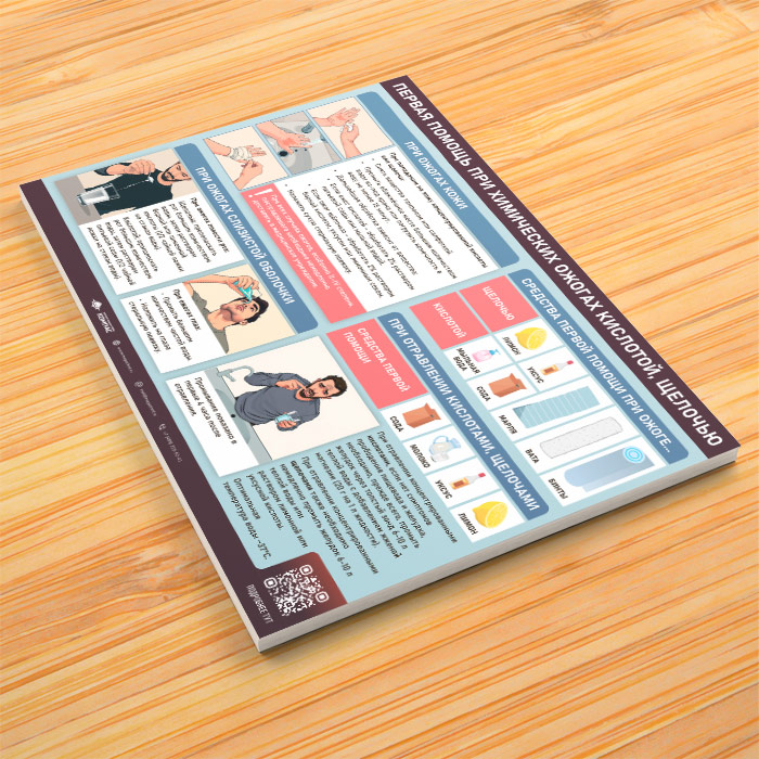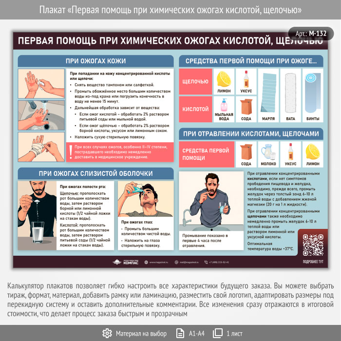 Плакат «Первая помощь при химических ожогах кислотой, щелочью» с QR (М-132, 1 лист) в Иркутске купить