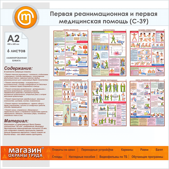 Плакат «Оказание первой помощи пострадавшим» (С-39, ламинированная бумага, А2, 6 листов) в Иркутске купить