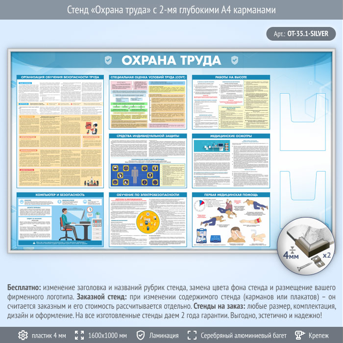 Стенд «Охрана труда» с 2-мя глубокими А4 карманами (OT-35.1-SILVER) в Иркутске купить