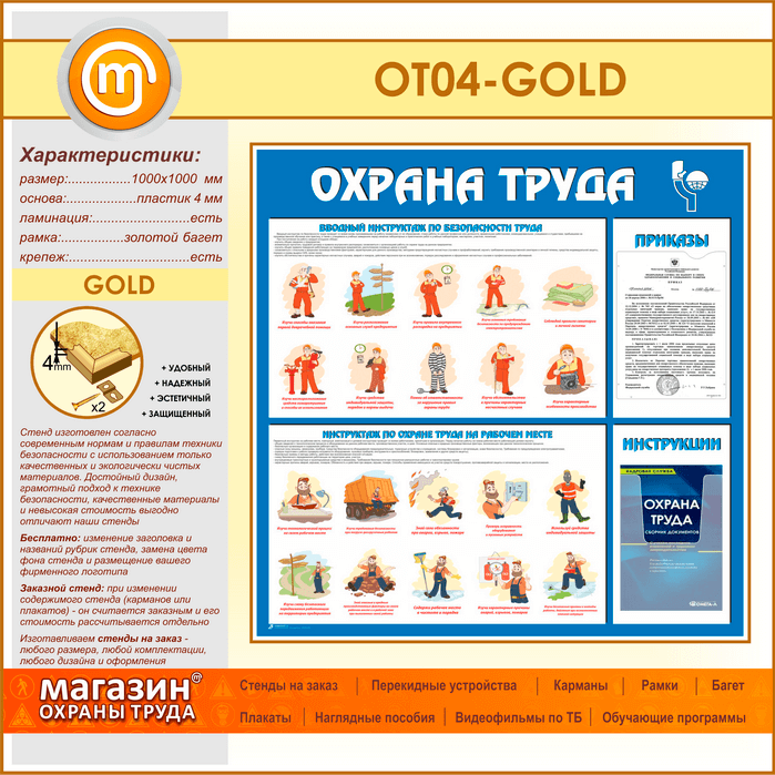 Стенд «Охрана труда» с плоским и объемным карманами (OT-04-GOLD) в Иркутске купить