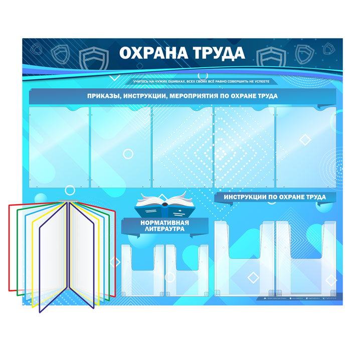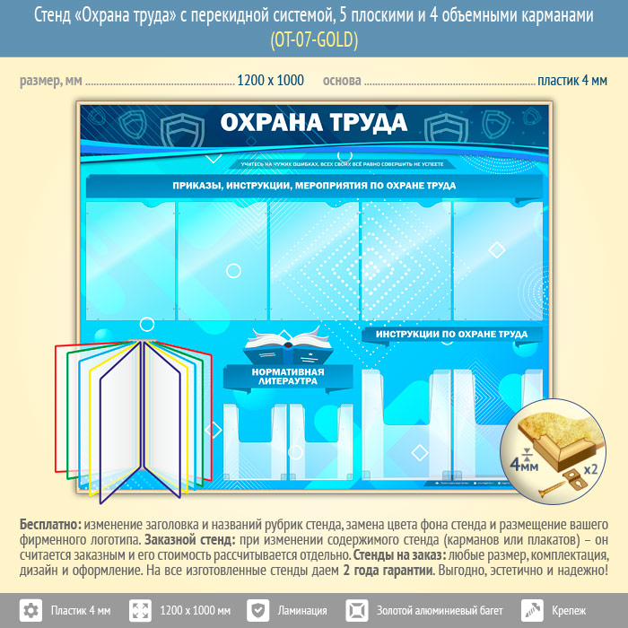 Стенд «Охрана труда» с перекидной системой, 5 плоскими и 4 объемными карманами (OT-07-GOLD) в Иркутске купить