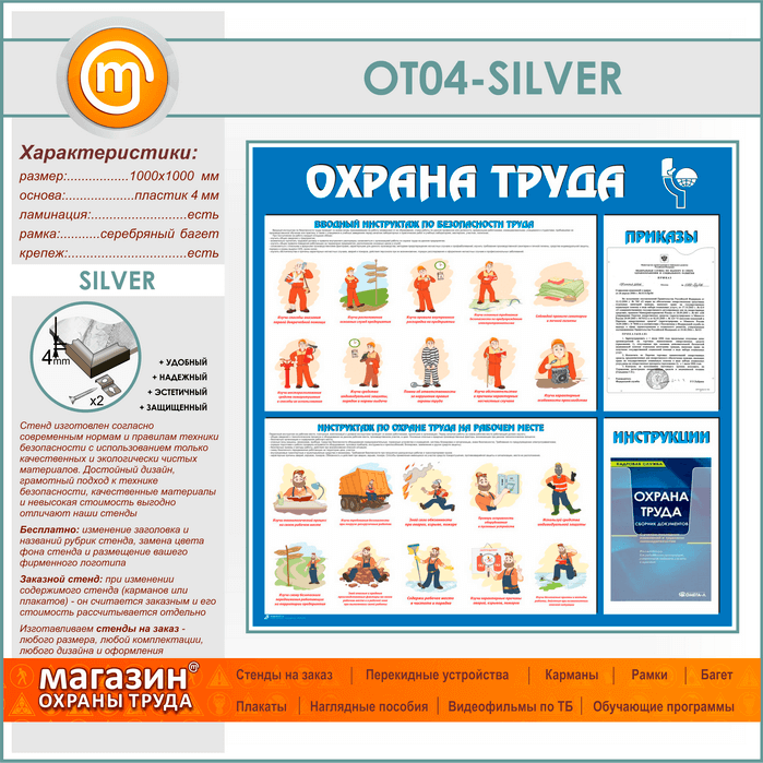 Стенд «Охрана труда» с плоским и объемным карманами (OT-04-SILVER) в Иркутске купить
