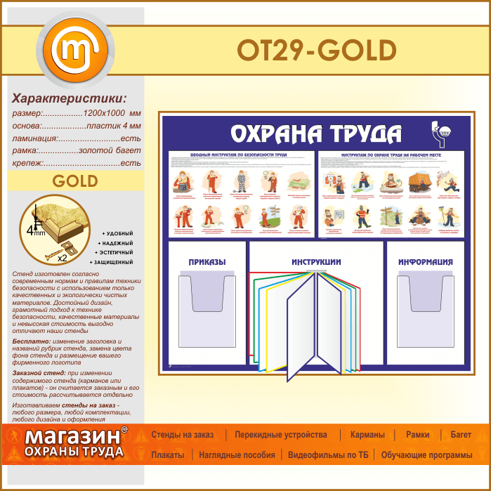 Стенд «Охрана труда» с перекидной системой и 2 объемными карманами (OT-29-GOLD) в Иркутске купить
