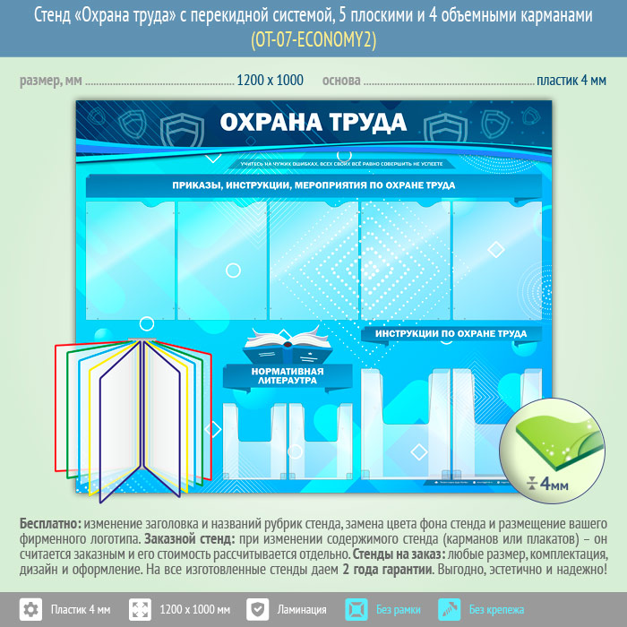 Стенд «Охрана труда» с перекидной системой, 5 плоскими и 4 объемными карманами (OT-07-ECONOMY2) в Иркутске купить