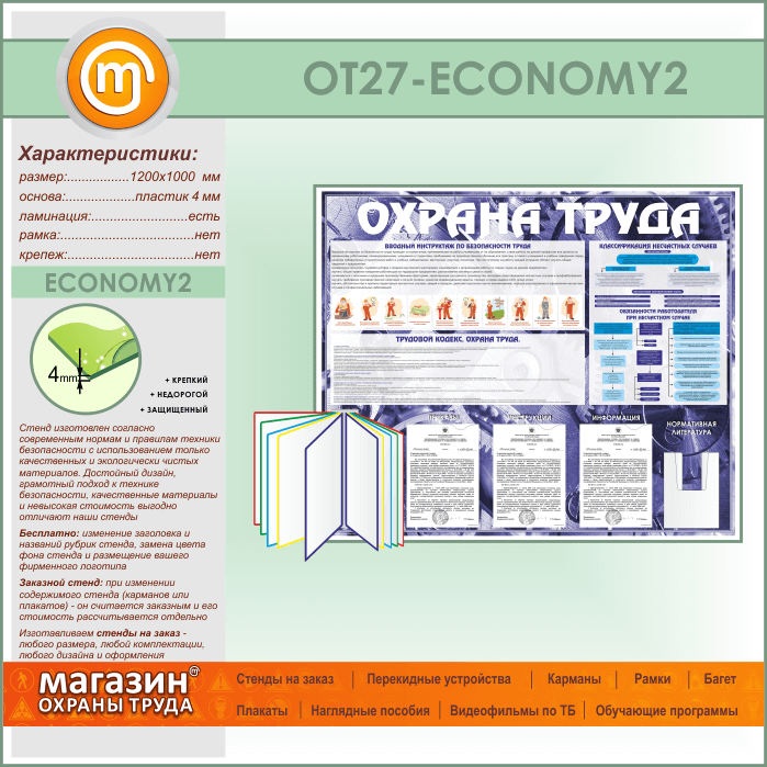 Стенд «Охрана труда» с перекидной системой, 3 плоскими и 1 объемным карманом (OT-27-ECONOMY2) в Иркутске купить