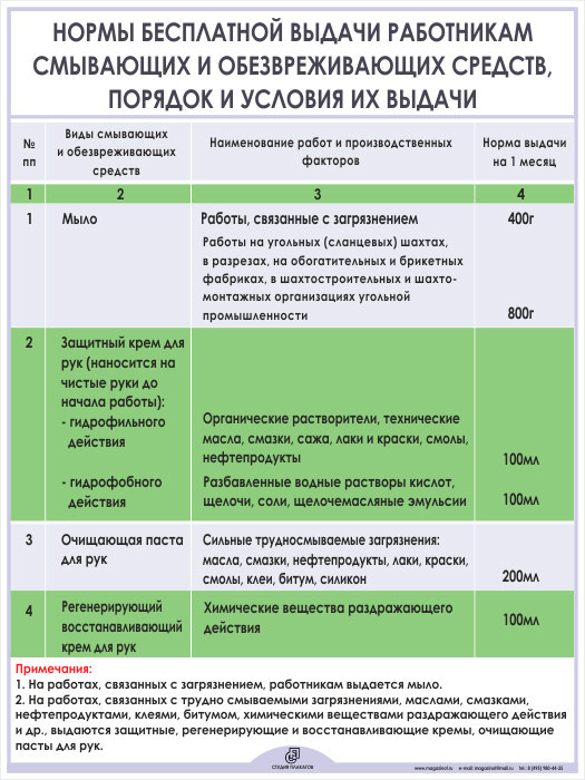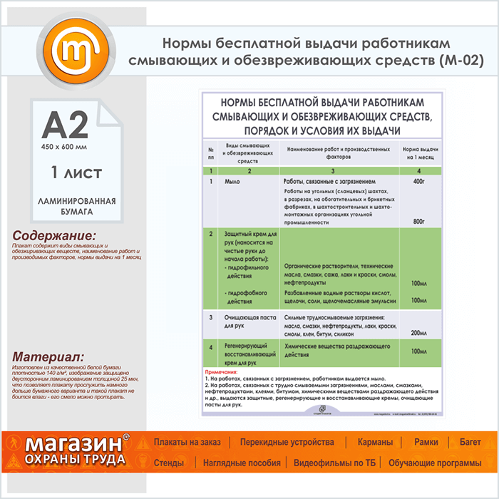 Плакат «Нормы бесплатной выдачи работникам смывающих и обезвреживающих средств» (М-02, ламинированная бумага, А2, 1 лист) в Иркутске купить