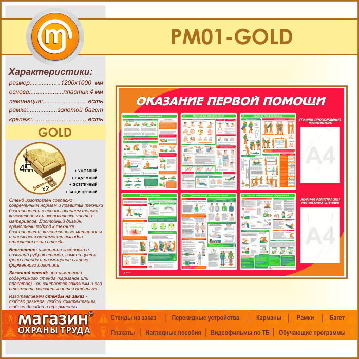 Стенд «Оказание первой помощи» с плоским и объемным карманами (PM-01-GOLD) в Иркутске купить