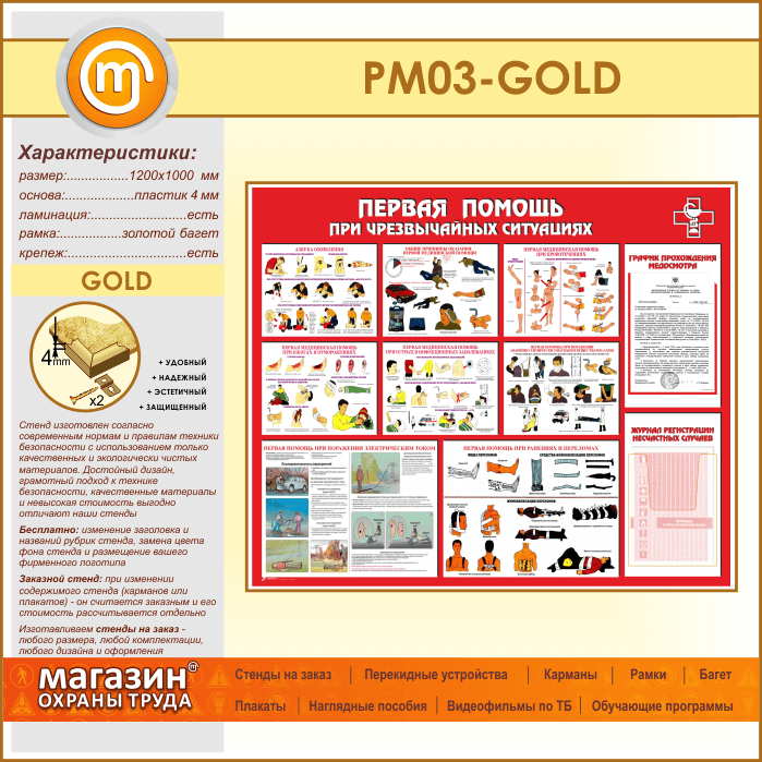 Стенд «Первая помощь при чрезвычайных ситуациях» с плоским и объемным карманами (PM-03-GOLD) в Иркутске купить