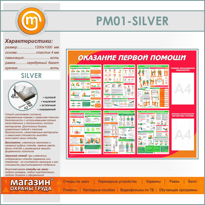 Стенд «Оказание первой помощи» с плоским и объемным карманами (PM-01-SILVER) в Иркутске купить