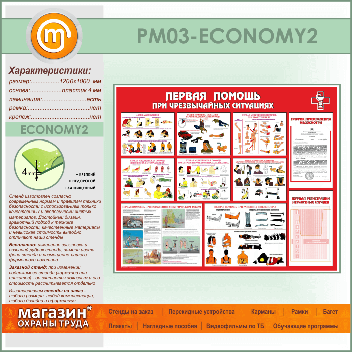 Стенд «Первая помощь при чрезвычайных ситуациях» с плоским и объемным карманами (PM-03-ECONOMY2) в Иркутске купить