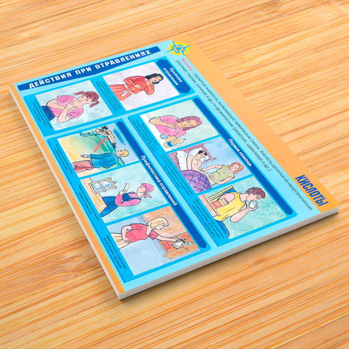 • Плакат «Кислоты» – признаки отравления, первая помощь, профилактика отравлений