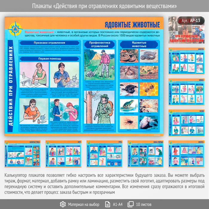 Комплект плакатов «Действия при отравлениях ядовитыми веществами» из 10 листов может быть изготовлен любого формата и размера, на бумаге, самоклеящейся пленке, пластике, баннерной ткани и металле. Разрабатываем, рисуем и изготавливаем плакаты на любую интересующую Вас тематику