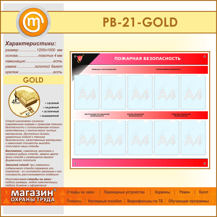 Стенд «Пожарная безопасность» с 10 карманами (PB-21-GOLD) в Иркутске купить
