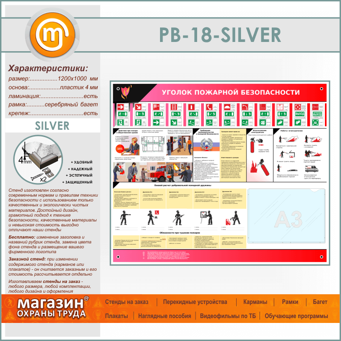 Стенд «Уголок пожарной безопасности» с карманом А3 формата (PB-18-SILVER) в Иркутске купить