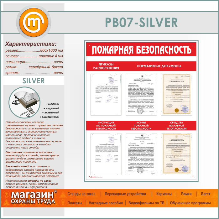 Стенд «Пожарная безопасность» с 6 карманами (PB-07-SILVER) в Иркутске купить