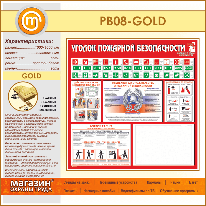 Стенд «Уголок пожарной безопасности» с карманом А3 формата (PB-08-GOLD) в Иркутске купить