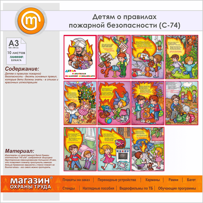 Плакаты «Детям о правилах пожарной безопасности» (С-74, ламинированная бумага, А3, 10 листов) в Иркутске купить