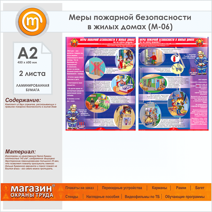 Плакаты «Меры пожарной безопасности в жилых домах» (М-06, ламинированная бумага, А2, 2 листа) в Иркутске купить
