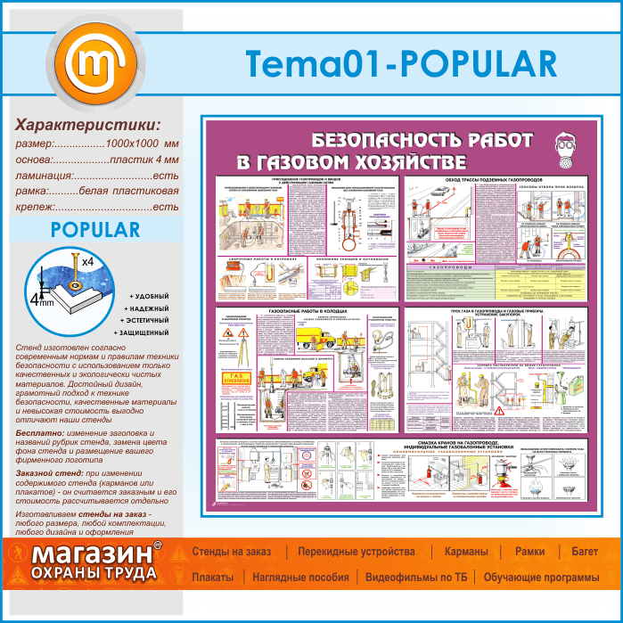 Стенд «Безопасность работ в газовом хозяйстве» – обучающая наглядная информация: присоединение газопроводов и вводов к действующим газовым сетям, сварочные работы в котловане и крепление траншей и котлованов, обход трассы подземных газопроводов и способы отбора проб воздуха, газоопасные работы в колодцах, пуск газа в газопроводы и газовые приборы, устранение закупорок…