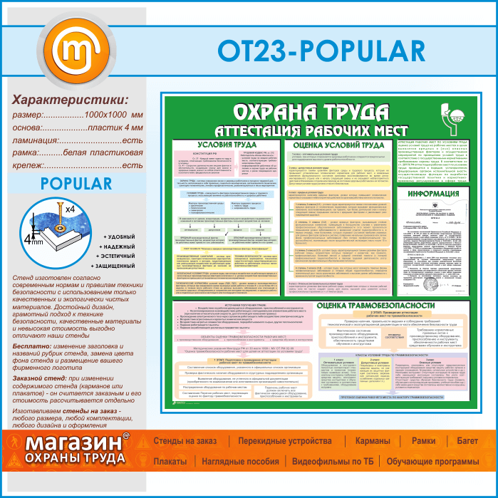 Стенд «Охрана труда. Аттестация рабочих мест» – это яркая информация, представленная в виде таблиц об условиях труда – конституция и трудовой кодекс, оценка условий труда – классы и степень условий, оценка травмобезопасности – проведение аттестации, проверка соответствия, источники травм и классы условий труда, а также 1 плоский карман А4 формата для самостоятельного размещения информации…