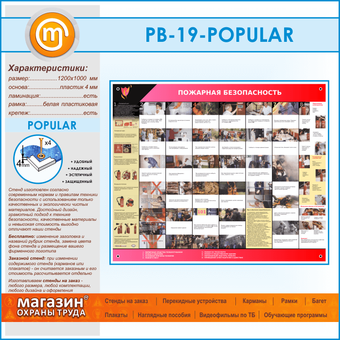 Стенд по пожарной безопасности представляет собой набор качественных тематических фотографий по пожарной безопасности с основным описанием первичных средств пожаротушения, причинами пожаров, порядком и действию во время пожарной ситуации, мерам по обеспечению порядка во время пожара – что делать, если пожар начался в квартире или в общественном здании, на транспорте или в лесу, изображены поражающие факторы пожара и приведение огнетушителя в действие и его использование